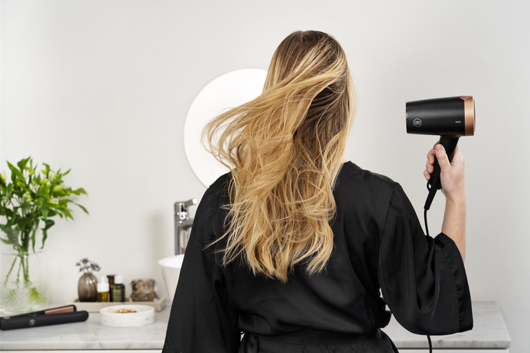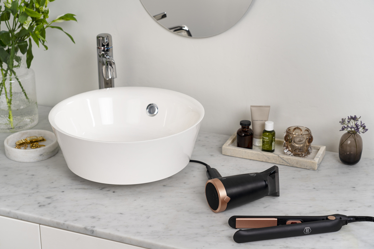 Glam og Shine styling kit er det perfekte settet for å føne og style håret. Settet består av en hårføner og en rettetang. De har begge kompakt design og lav vekt, slik at de enkelt kan oppbevares både hjemme og i kofferten når du er på farten. Designen er minimalistisk med kobberdetaljer.
